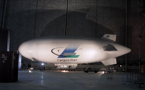 Charly, das CargoLifter Skyship 600, im westlichen Torbogen der Halle. Das Luftschiff ist ca. 60 m lang, doch im Vergleich zu den Dimensionen der Halle war es ein Winzling.... Im Hintergrund sind die beweglichen Torsegmente zu erkennen.