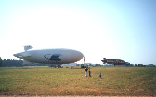 Das CargoLifter "Skyship 600B" (N 602 CL), sowie die beiden Lightships (Goodyear "Spirit of Europe I" und Mazda "El Vira") auf dem Flugplatz Bad Waldsee/Reute Nahe Friedrichshafen a.B.