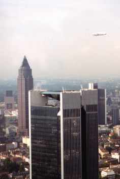 Der Zeppelin NT am Messegelände Frankfurt am Main. Auf der linken Seite ist der Messeturm gut zu erkennen.